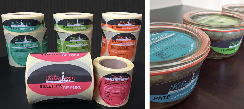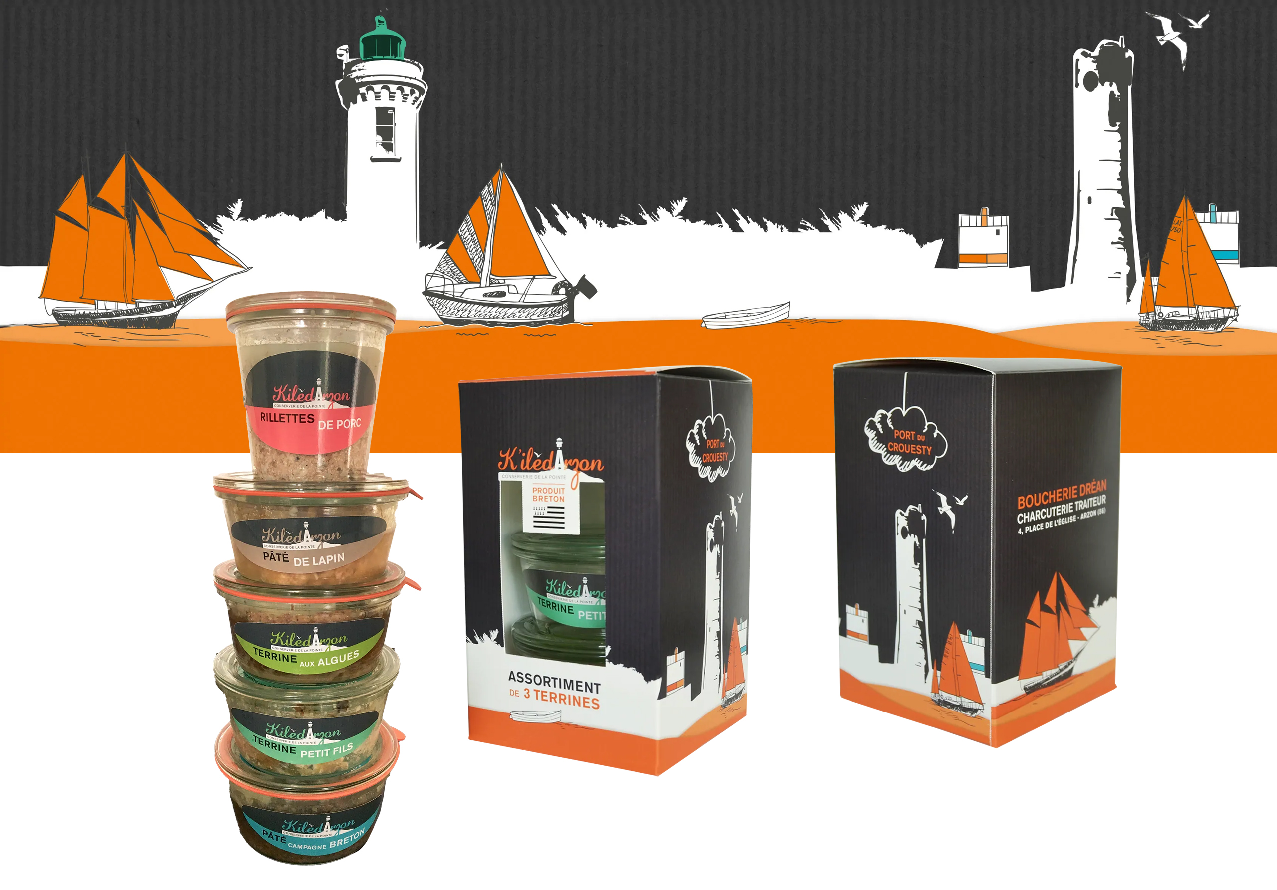 Le logo utilise l’orange (dynamisme) ainsi que le noir et le blanc (couleurs traditionnelles de Bretagne). Pour les étiquettes des terrines et rillettes, les couleurs varient selon les saveurs et un effet craft renforce l’aspect artisanal des produits.