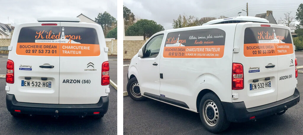 Cette identité visuelle devait être déclinable sur l’ensemble des supports de communication de l’entreprise, notamment les étiquettes de ses produits artisanaux (terrines, rillettes, plats cuisinés, sauces…), le coffret de ses fabrications et son véhicule professionnel.