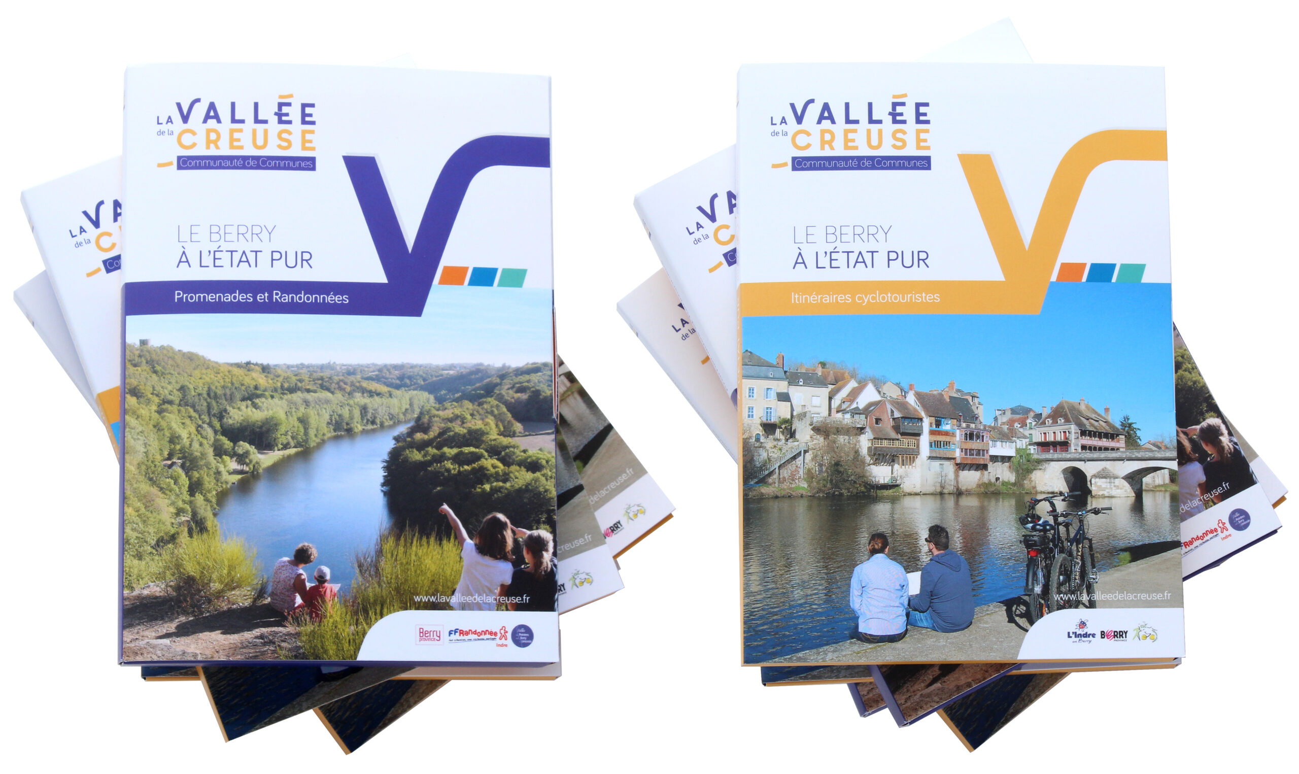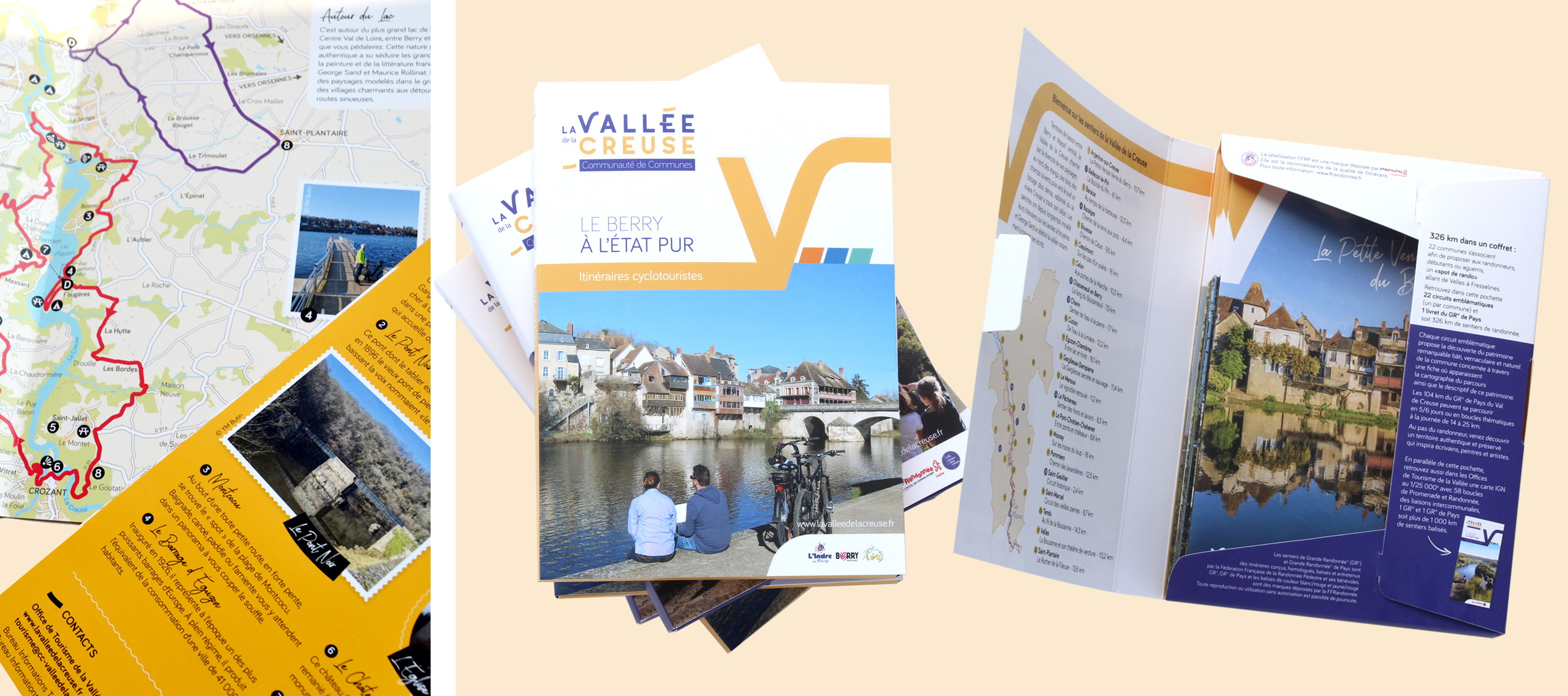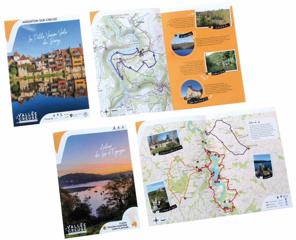 Afin de valoriser ses itinéraires de promenade, de randonnée et cyclotouristiques, la Communauté de Communes La Vallée de la Creuse a lancé en 2020 et 2022 un appel à la création de supports graphiques et cartographiques : fiches descriptives avec coffrets de rangement, un panneau d’informations et 22 panneaux de départ.