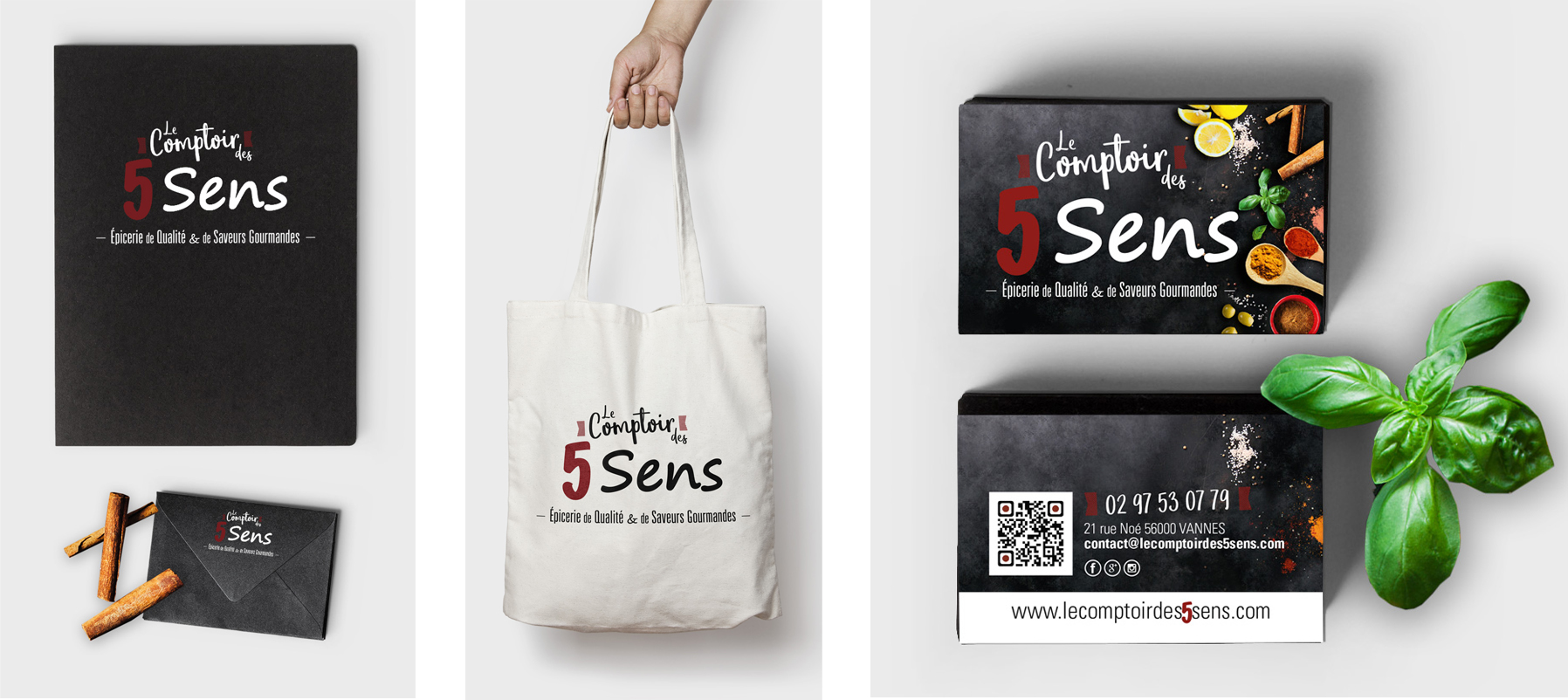 Pour mettre en image, avec justesse, la vision et les envies du client, nous avons réalisé un logo au style manuscrit, symbolisant le savoir-faire et l’authenticité. Le chiffre 5 est particulièrement mis en avant par sa couleur rouge, sa grande taille et sa typographie arrondie et épaisse, stimulant visuellement l’idée de parfums, goûts et textures. La baseline « Épicerie de Qualité & de Saveurs Gourmandes » est en lettres fines et élégantes, apportant ainsi une touche « premium ». Nous avons décliné le logo sur des cartes de visite, des enveloppes, des pochettes, des tog bags et créé l’enseigne de l’épicerie.