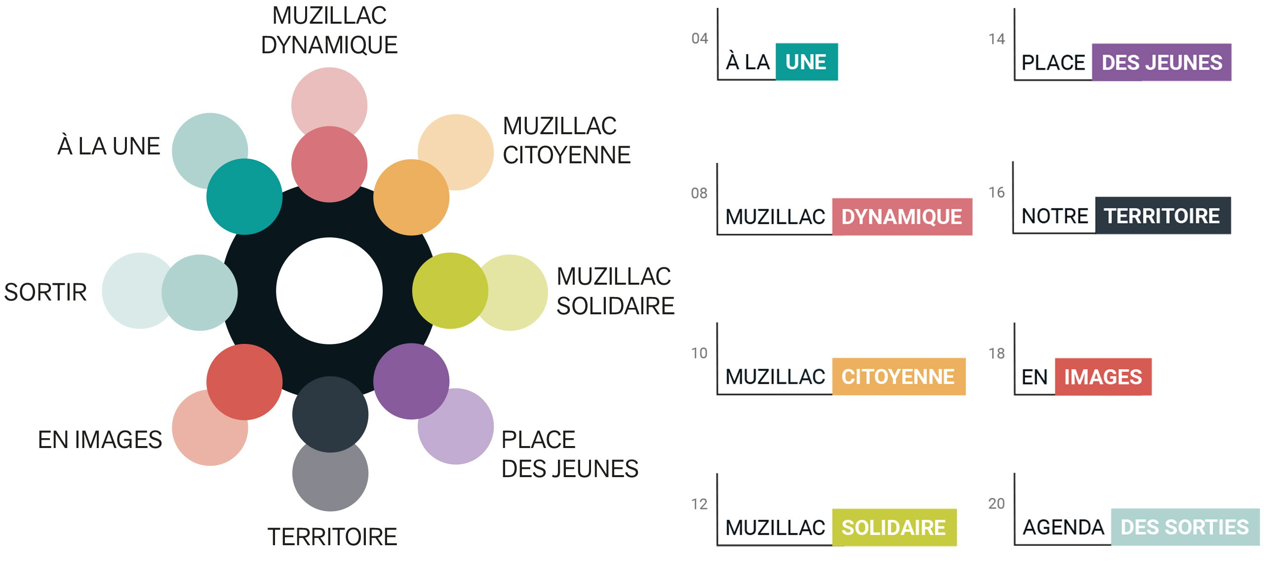 Tous les éléments graphiques (illustrations, infographies et pictogrammes) ont été créés dans un style homogène et unique, en lien direct avec la nouvelle identité visuelle de Muzillac. Le résultat est un magazine lisible, accessible, et surtout, humain. Ce magazine est conçu pour être une lecture efficace et agréable, reflétant une identité moderne et forte, tout en étant au service de la communication de votre ville.
