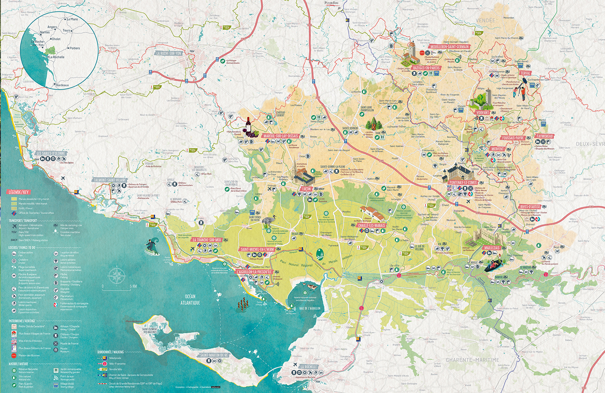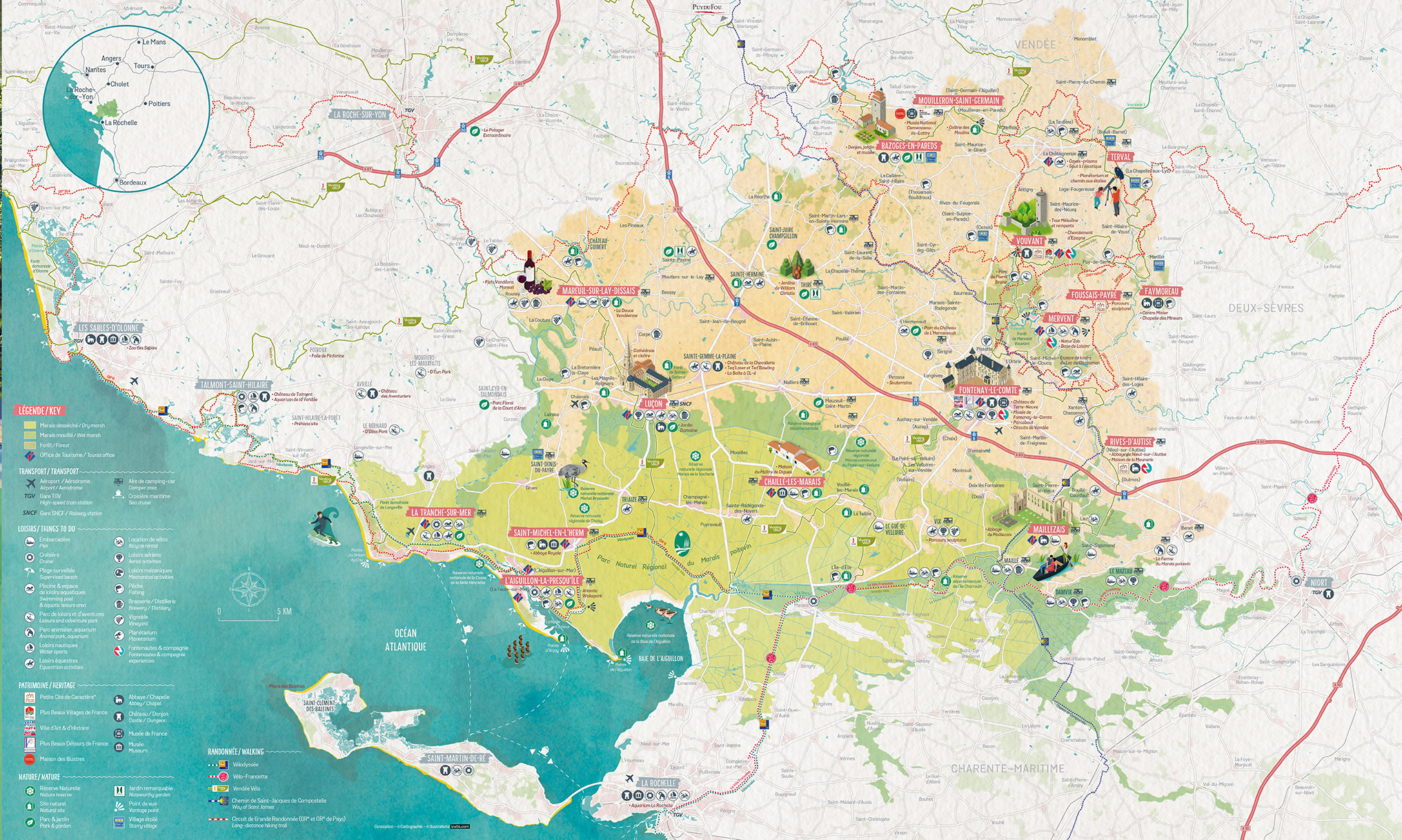 • Utilisation de pictogrammes personnalisés pour identifier loisirs et services, et d’illustrations dédiées pour mettre en avant le patrimoine incontournable (POI).