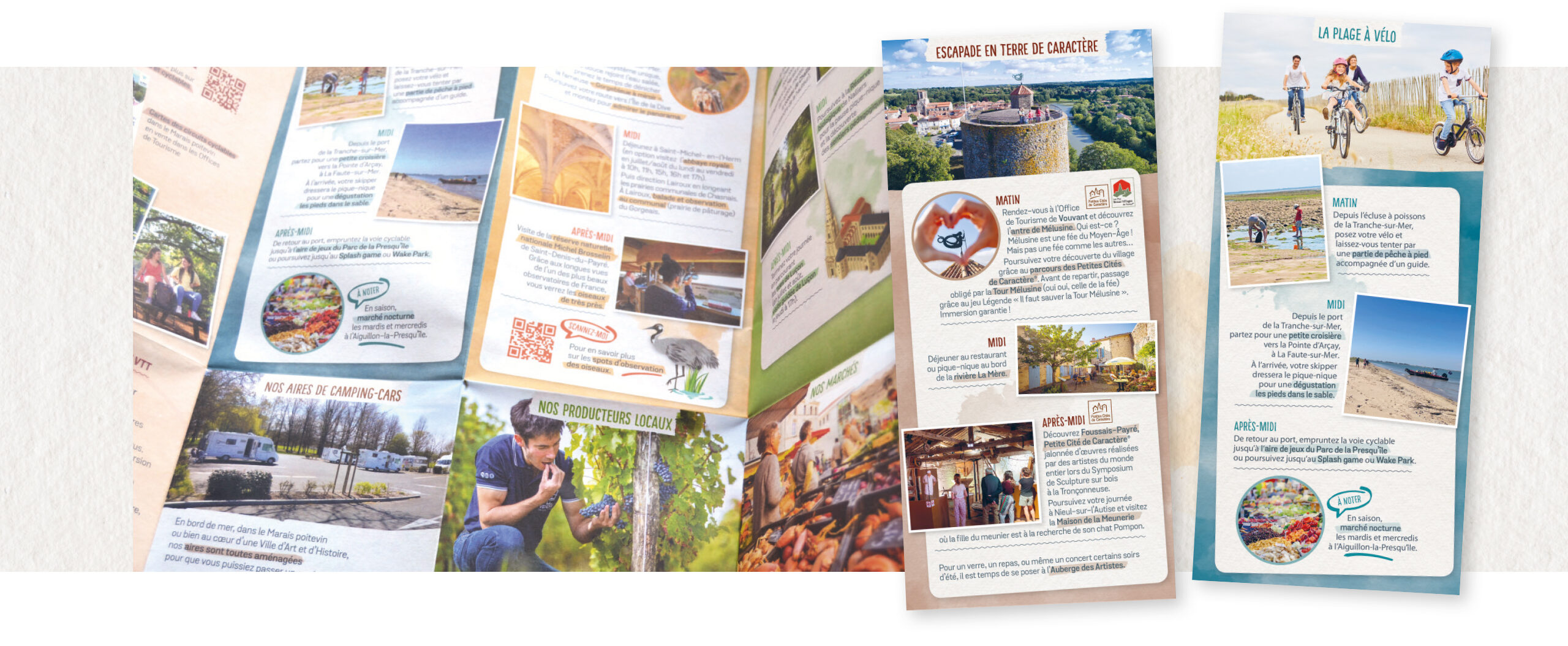 Au verso, un éventail d’idées de séjours et d’itinéraires variés a été mis en page avec soin. La lisibilité du contenu, la hiérarchisation des niveaux de lecture, et l’équilibre des couleurs ont été au centre de notre démarche.